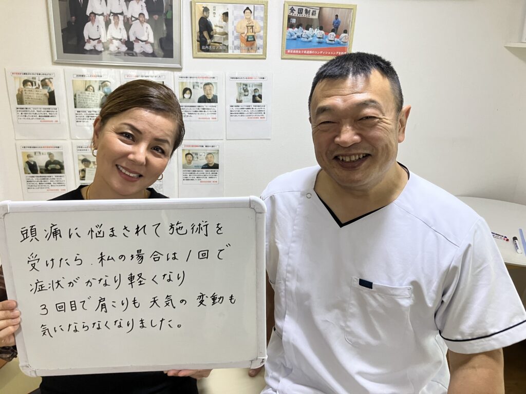 雨が降る前に頭が痛くなったりすることがなくなりました。肩こりもなくなり、姿勢も良くなりました。長い間頭痛に悩んでいる人や、体に不調を感じている人にお勧めしたいです。。